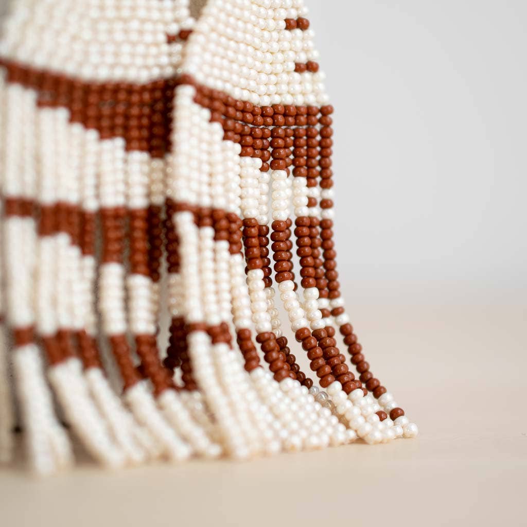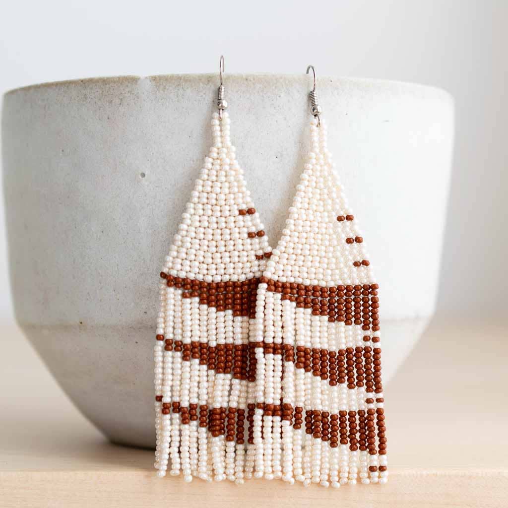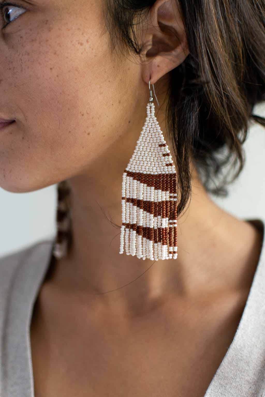 Intricate and bold, these beaded earrings have been intricately woven by artisan women in Guatemala.  The cinnamon brown contrasts with the bone white for a dramatic effect.