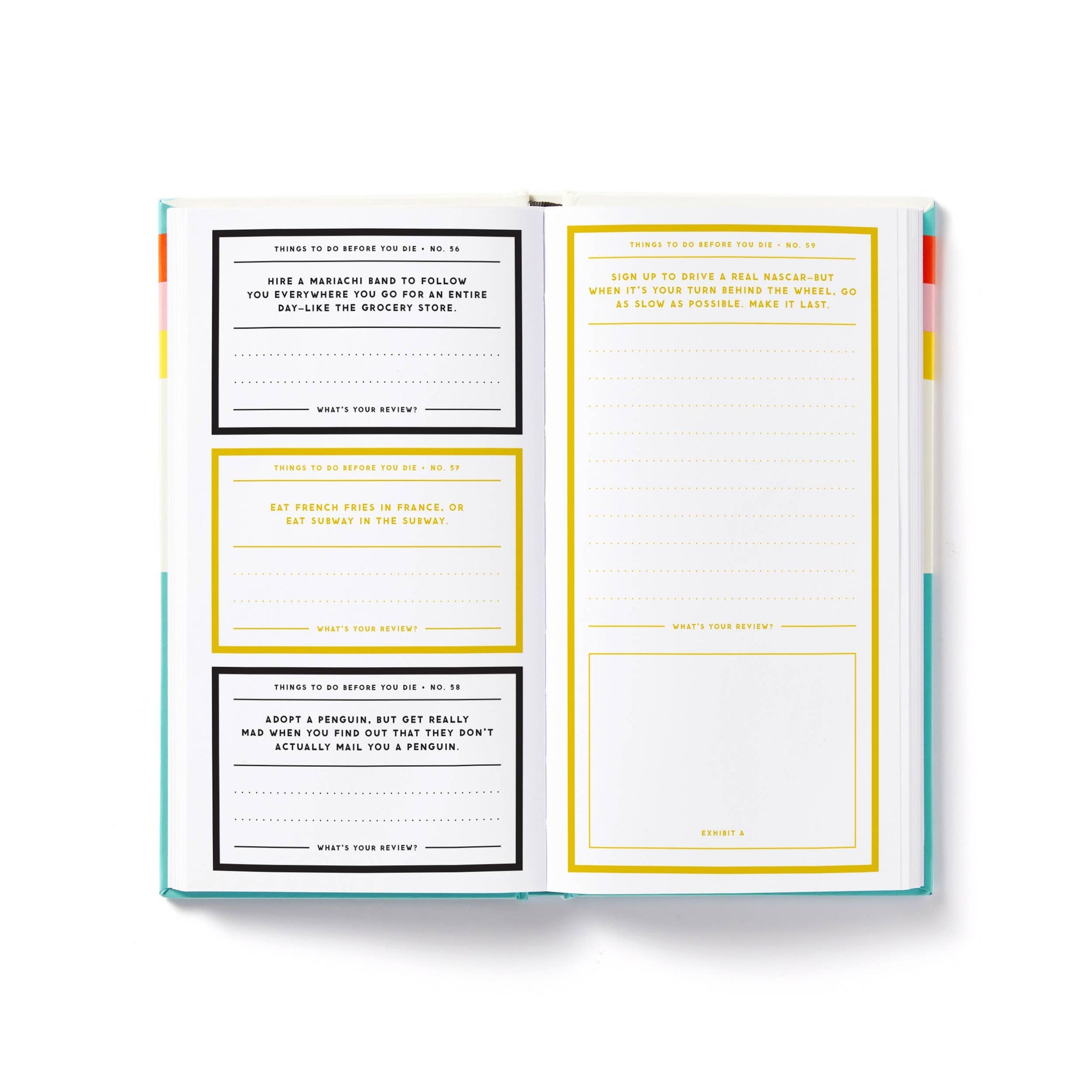 • PROMPTED JOURNAL – The A Million Things to Do Before You Die Prompted Journal from Brass Monkey features 200 unique and colorful pages filled with countless random things that everyone should do before they kick the bucket. Book measures 4.5" wide by 8.5" tall.