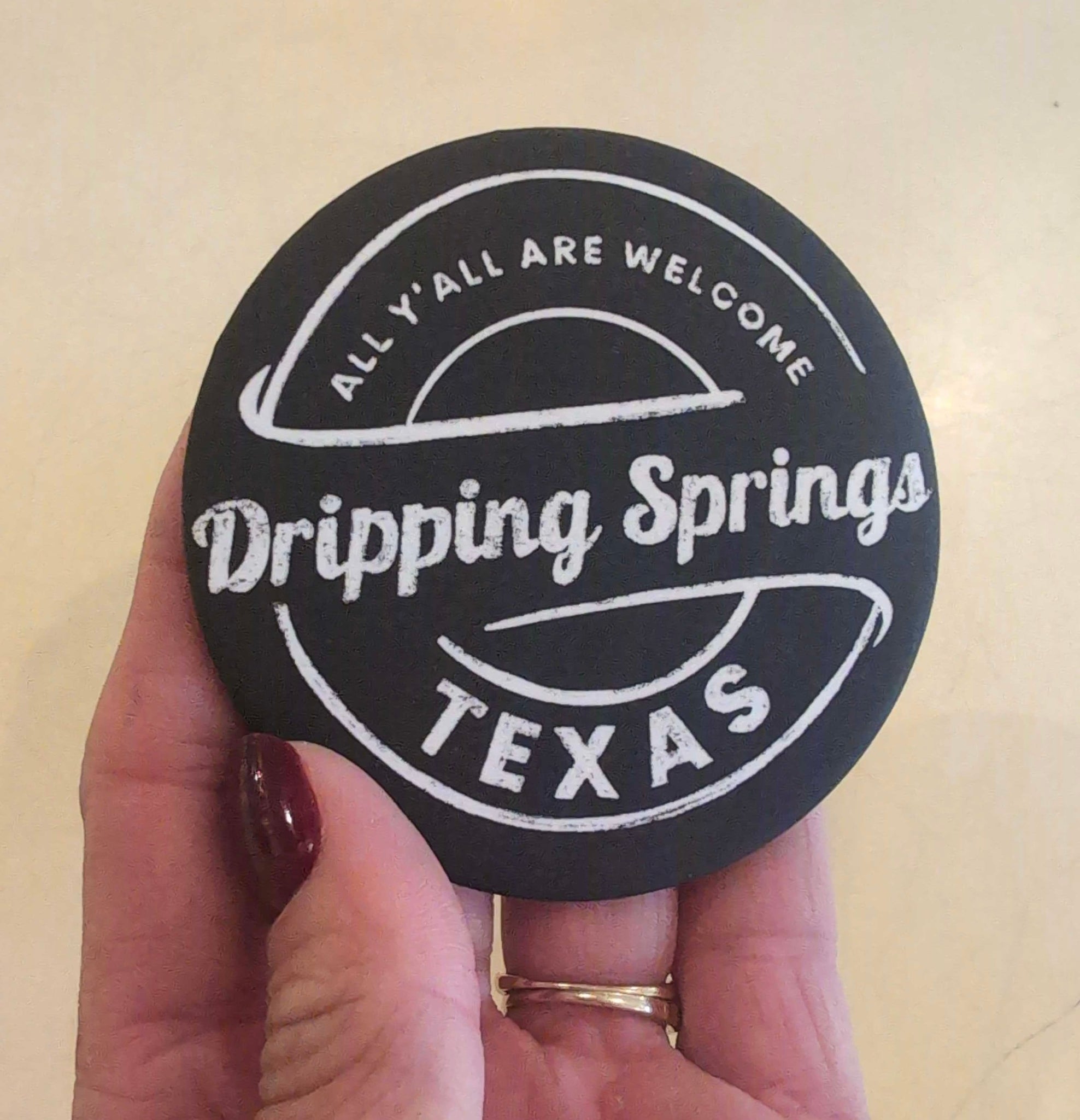 Retro circle fridge magnet of Dripping Springs. A keepsake that'll hang around for years to come! Show off your love of the Lone Star State with classic magnet and keep the Hill Country close to your heart!