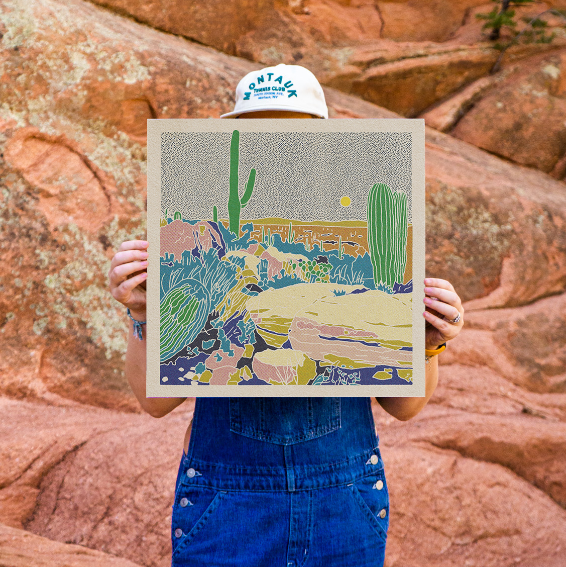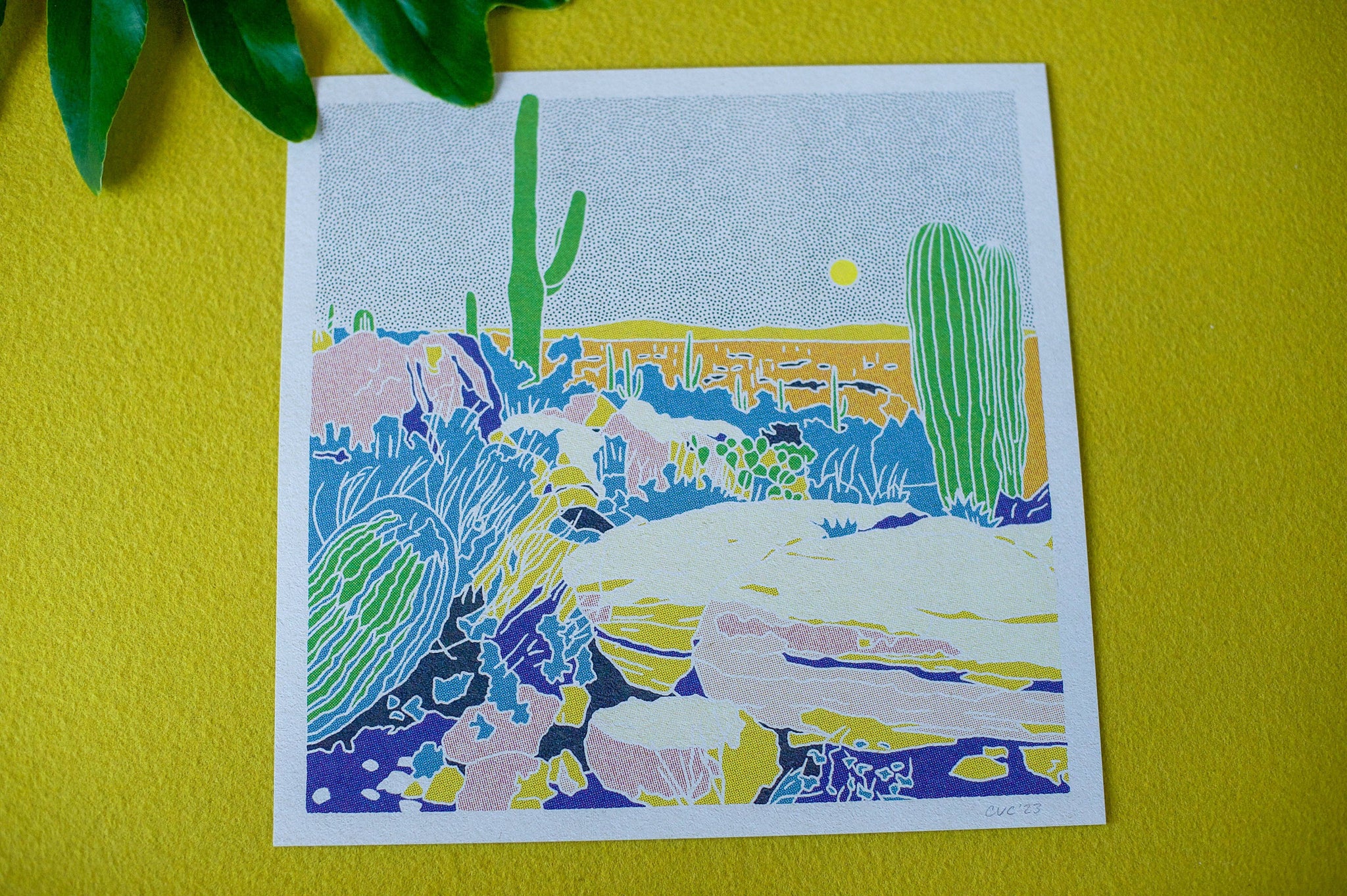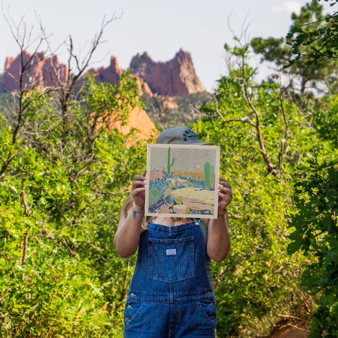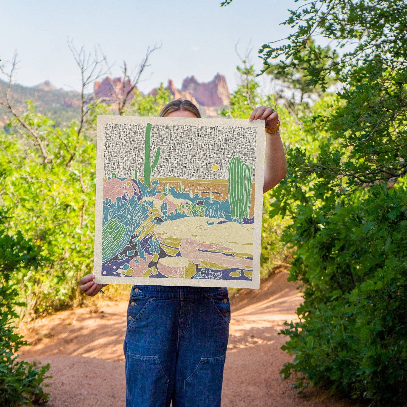 Desert Mountain #33 was created with a beautiful palette of blues and greens and is printed on FSC (Forest Stewardship Council) certified paper using giclée print technology! You can rest assured knowing that your love of nature is loving nature back. Note that some paper color and texture is printed on the paper.
