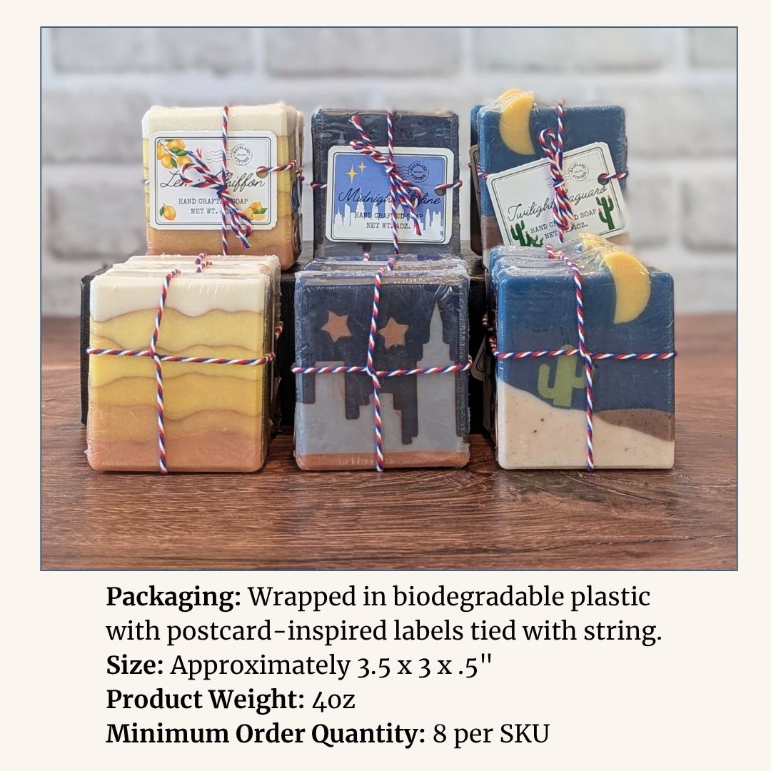 All soap bars are individually hand cut and average ~4-4.9oz. Soaps are wrapped in biodegradable plastic with post card inspired labels tied with string.