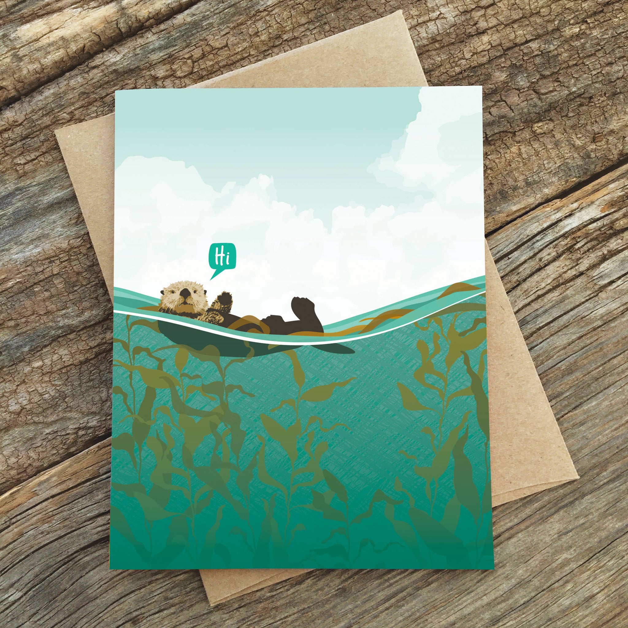 Blank inside. Size A2 (4.25" x 5.5"). Printed in the USA on heavy 100% PCW recycled paper. Paired with a 100% recycled brown kraft envelope. Packaged in a biodegradable cello sleeve. Say hi with this cute sea otter card!