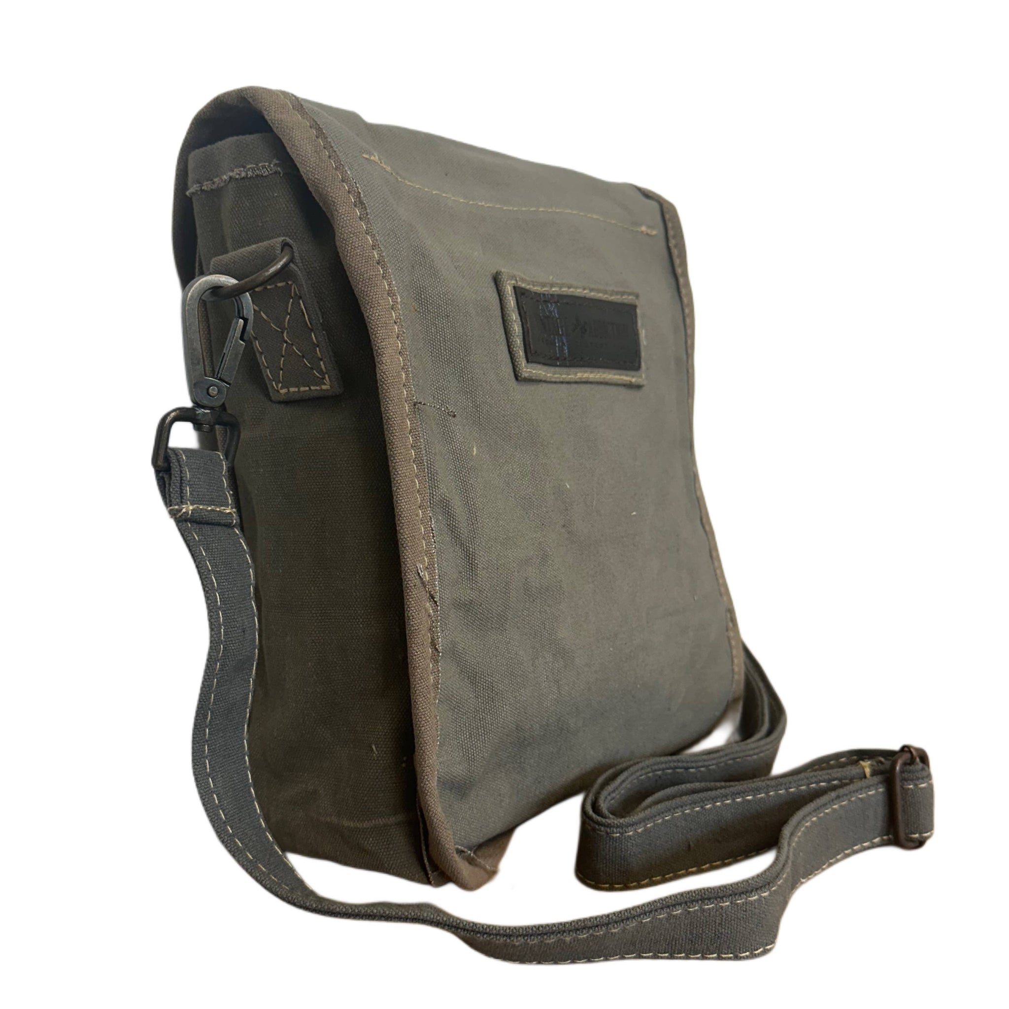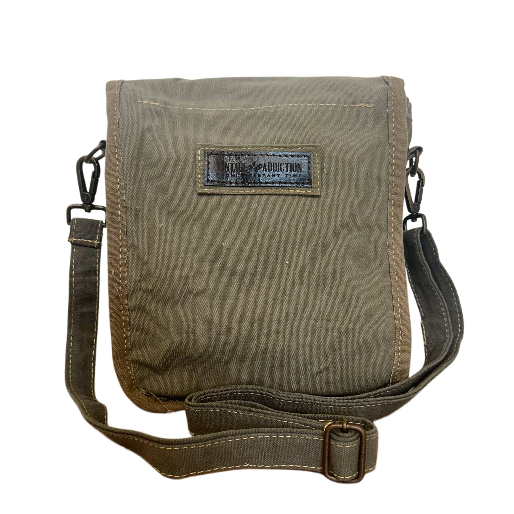 Our medium-sized crossbody is handcrafted using recycled military tents. This bag has a snap closure top as well as a top zipper closure under the front flap. Fully lined with 1 interior pocket. Bag measures 8"W x 9"H x 4"D and has a fixed 56" extendable strap. DISCLAIMER: Our recycled military tent bags are a tribute to and a reminder of the sacrifices and contributions of military veterans. Please know that these bags are made from authentic used military tents and are not brand-new canvas packaged as recycled tents or tarps. THESE ARE THE REAL DEAL!! As a result, the tent material will show signs of worn-like imperfections which add to its character. Each bag has differences in genuine imperfections, stains, and colors. Your bag will be as unique as each soldier's experience when seeking shelter in these tents whether in the training field or in a combat zone.
