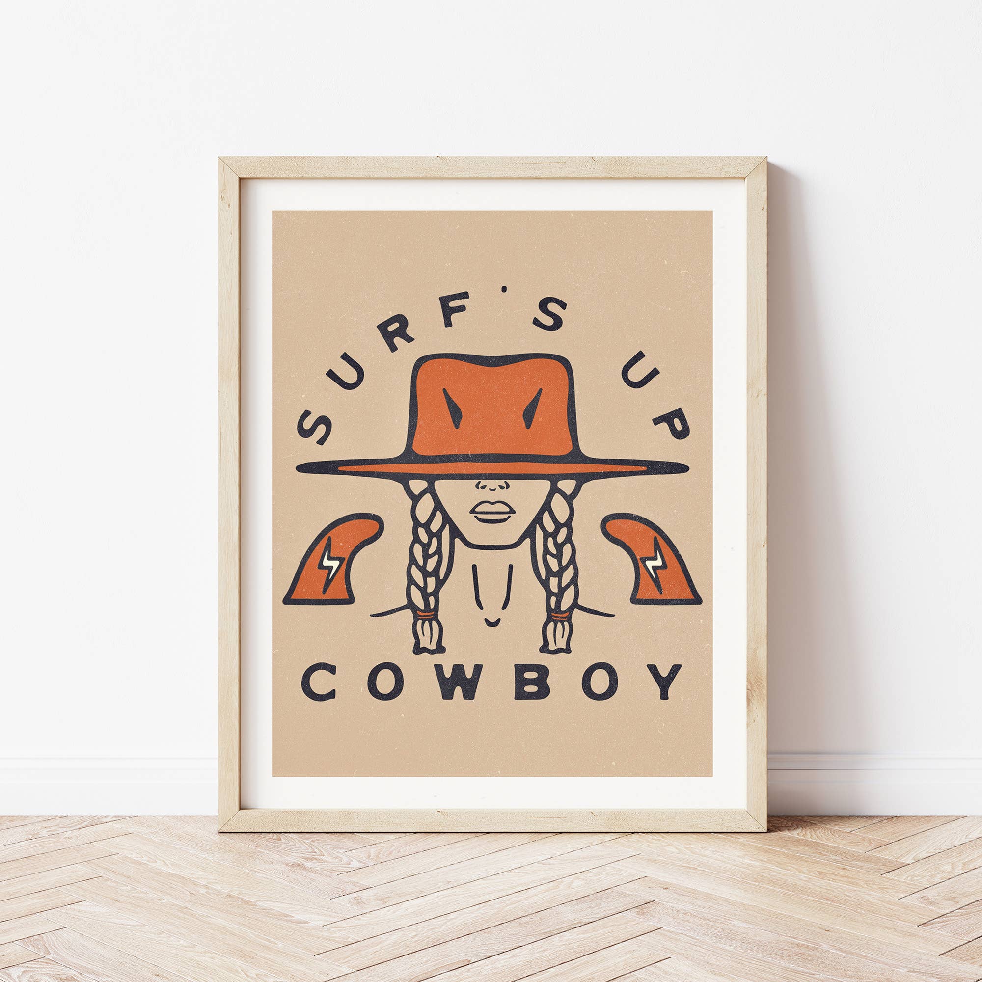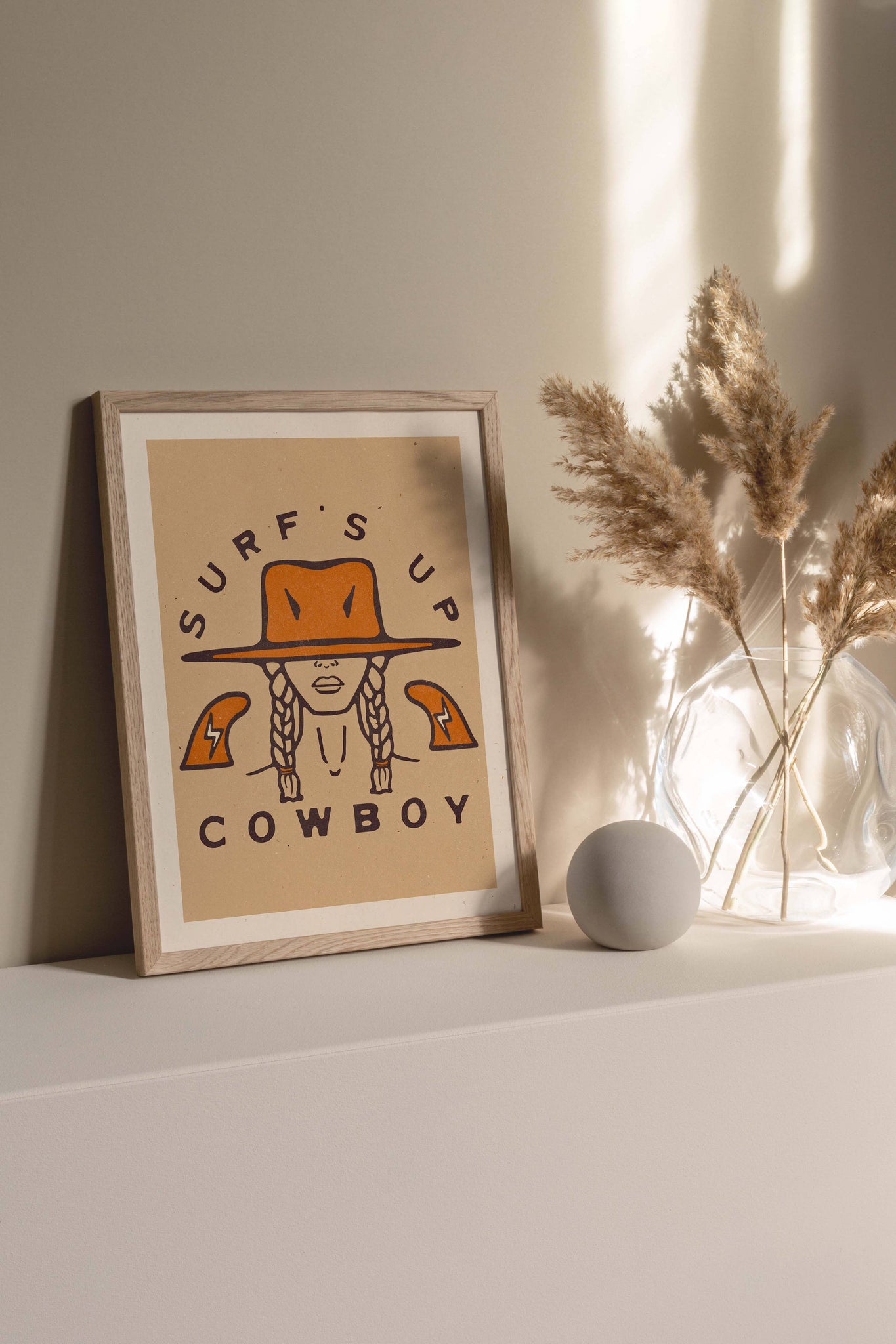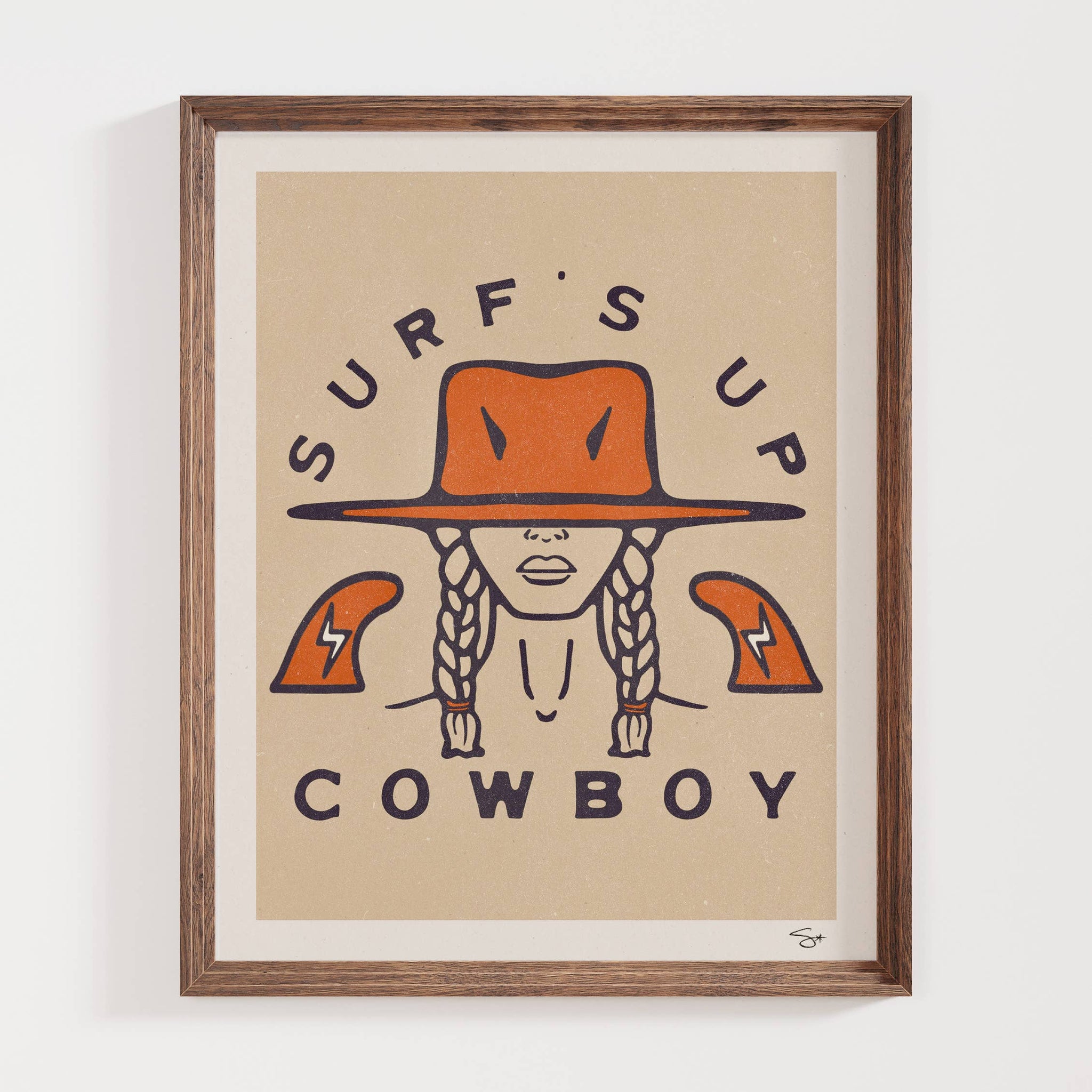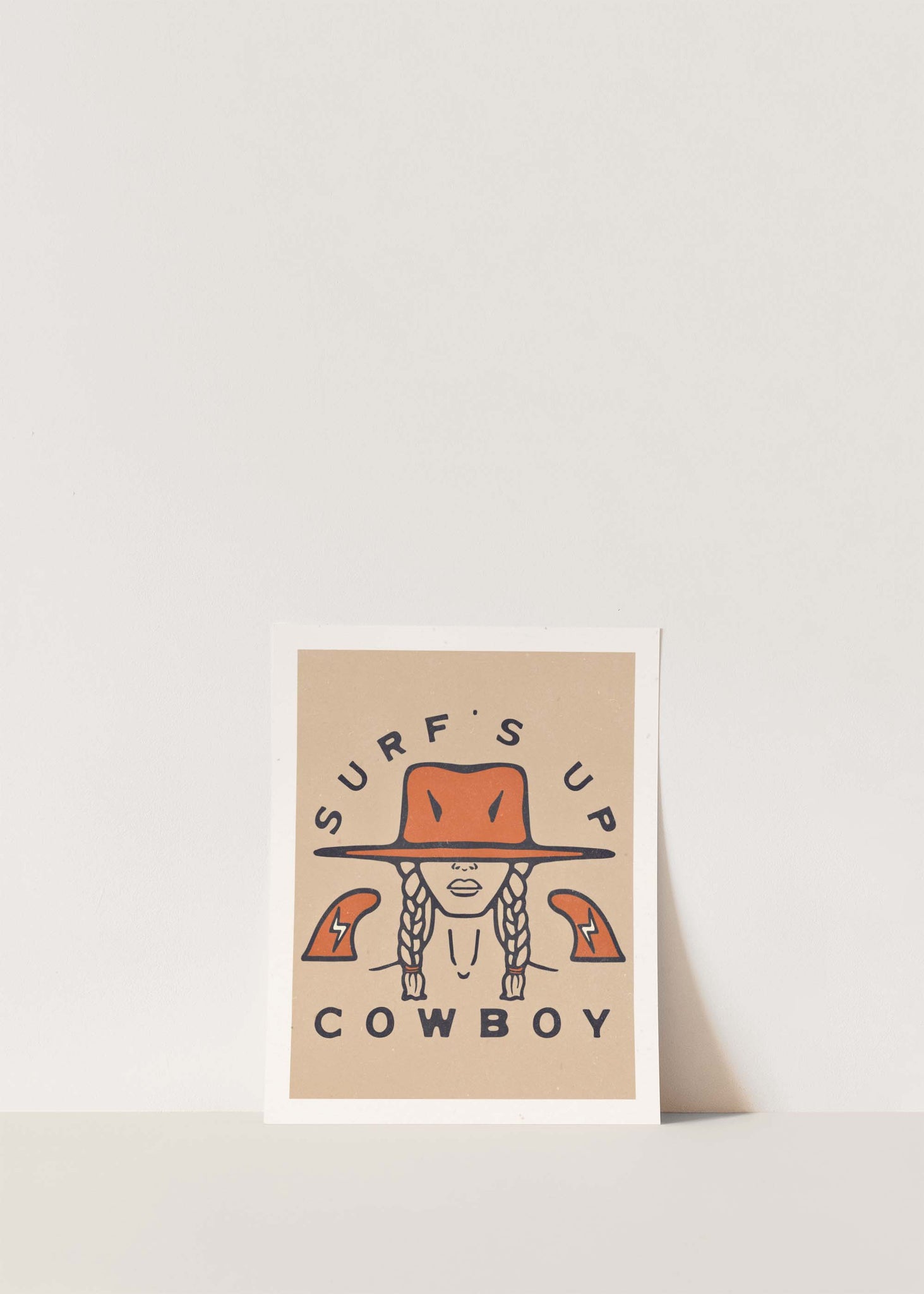 Coastal cowboy inspired art print for the surf enthusiast. High-quality print of original illustration on beautifully textured recycled paper. Unframed. The perfect trending addition to any coastal, bohemian, or vintage artistic aesthetic.