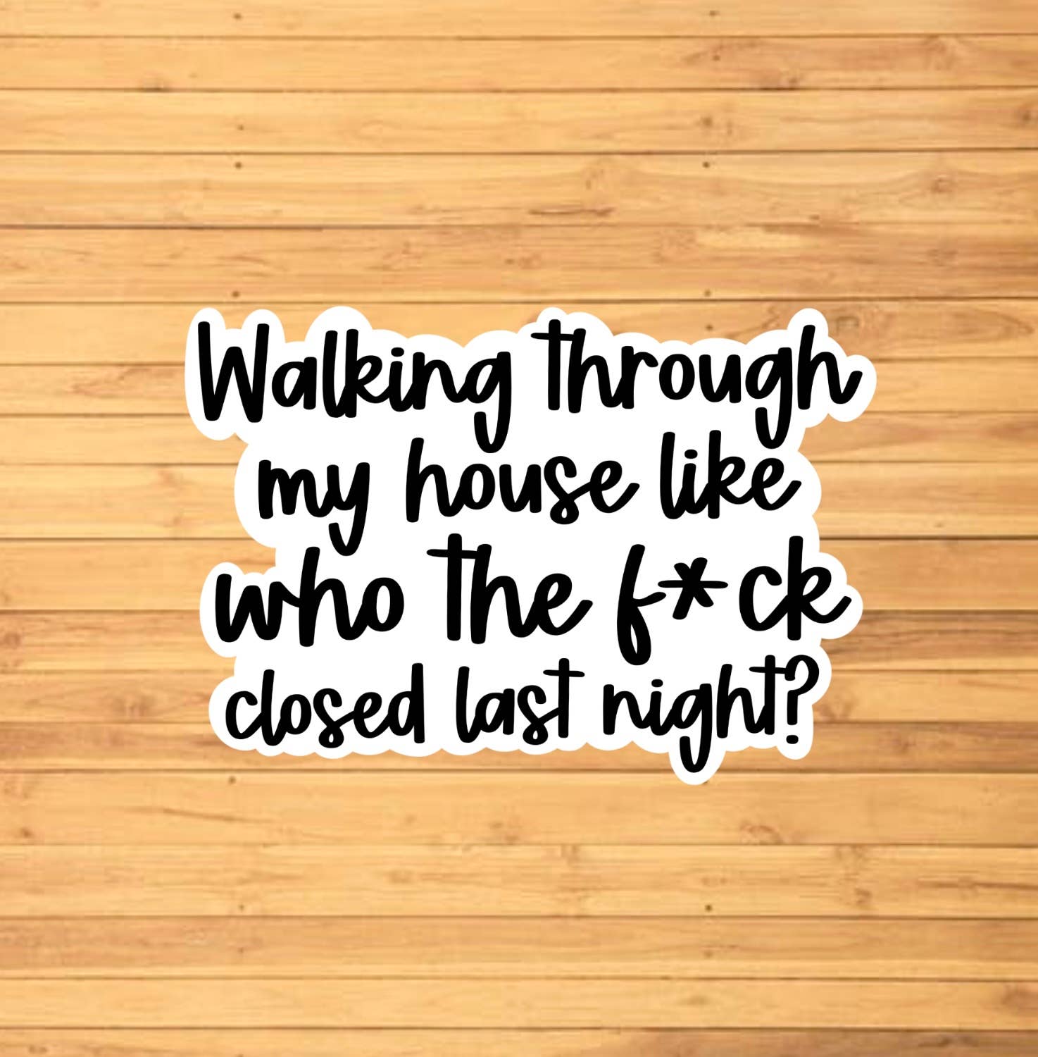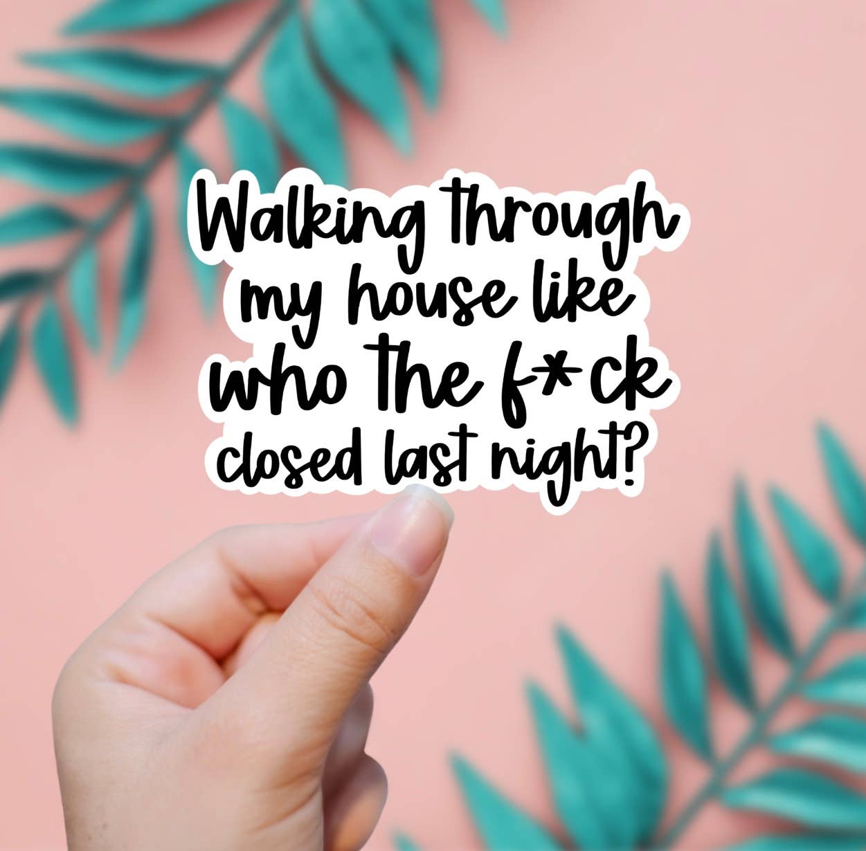 Add a splash of cheeky humor to your belongings with the "Who Closed Last Night?" sticker. Measuring about 3 x 3 inches and water-resistant, this playful sticker sticks with confidence—whether on your water bottle, laptop, or car.